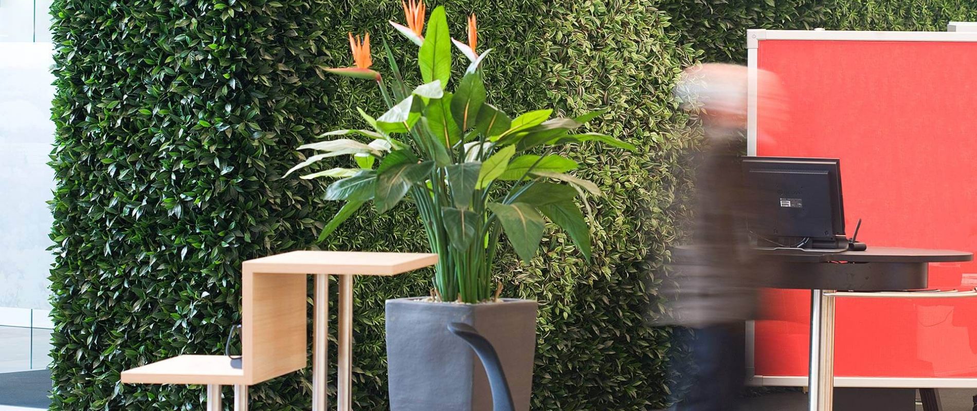 Grüne Wände sind immer ein besonderer Hingucker! Ob als lebende Wand mit echten Pflanzen oder als geschickter Raumteiler mit künstlichen Pflanzen - auch hier stehen Ihnen alle Möglichkeiten offen. Besonders in Großraumbüros, Empfangshallen oder Shoppingcentern fügen sich grüne Wände harmonisch in das Gesamtbild ein und bieten zusätzlich noch viele Vorteile, denn sie wirken nicht als Störfaktor, sondern als unterstützendes Element. Zusätzlich verbessern sie die Akustik ganz enorm, denn sie schlucken Geräusche und Lärm.
